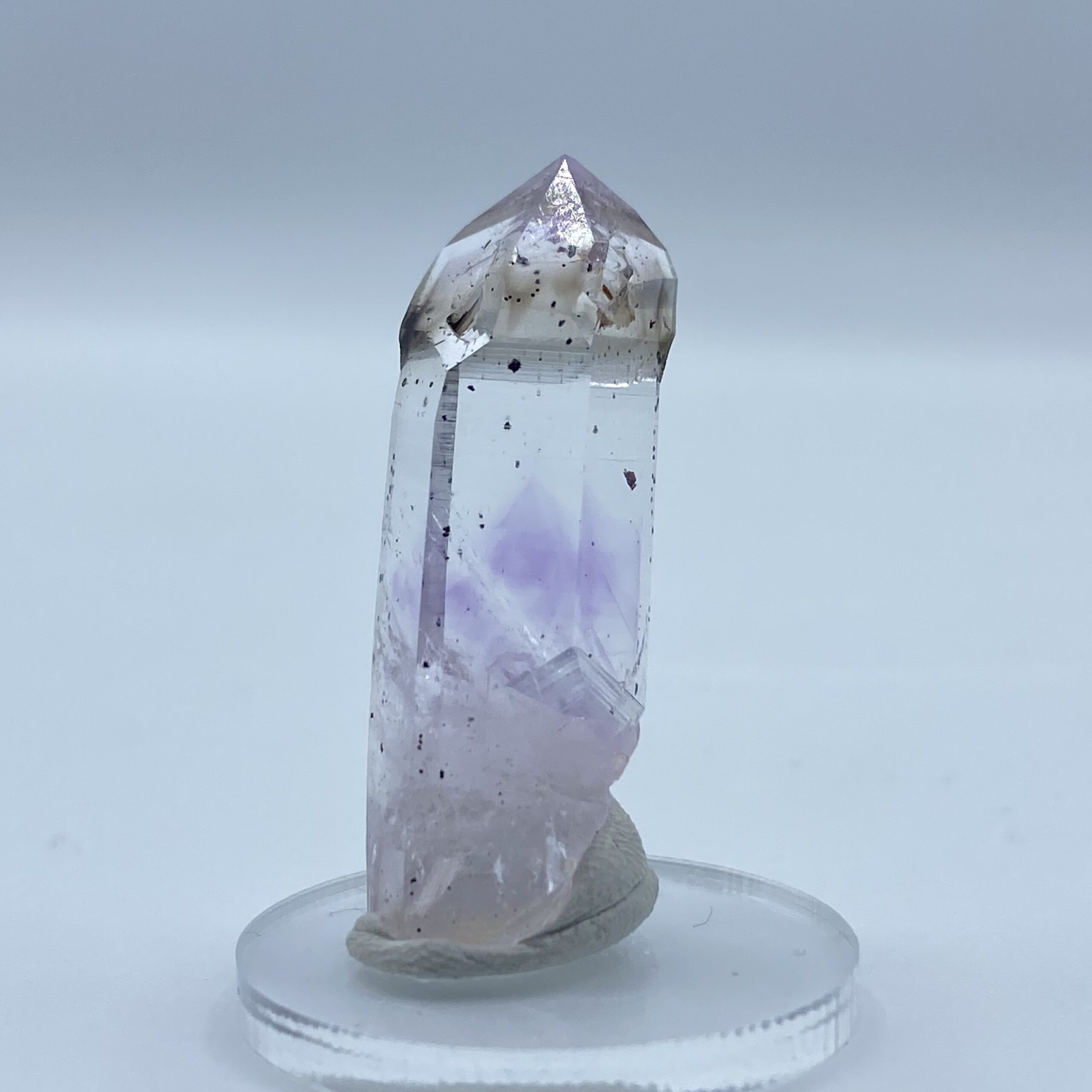 Unusual quartz scepter with smokey termination, hematite flecks, skeletal growth and the amethyst stem. Pure art and magical crystal. We would still call this a thumbnail.