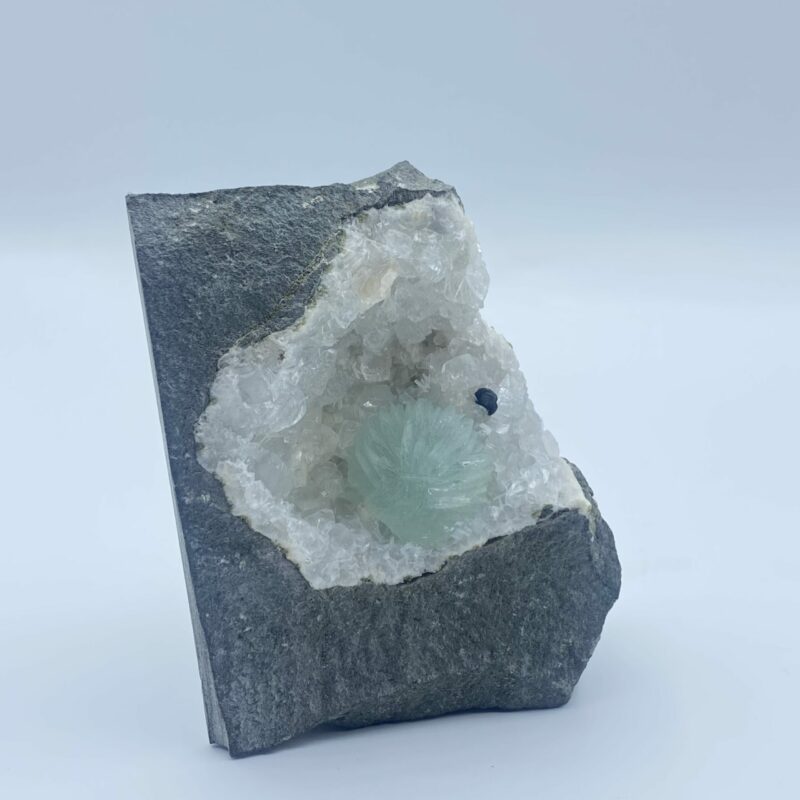 Very interesting prehnite crystalized ball inside a calcite pocket. Displays great!